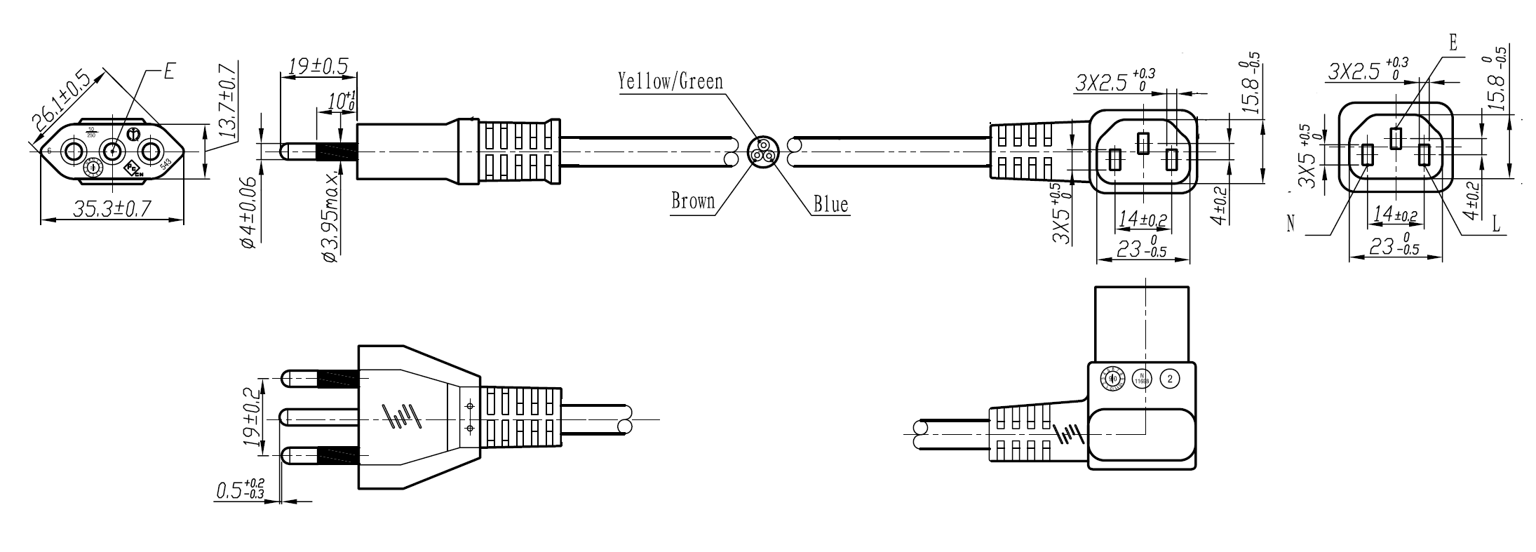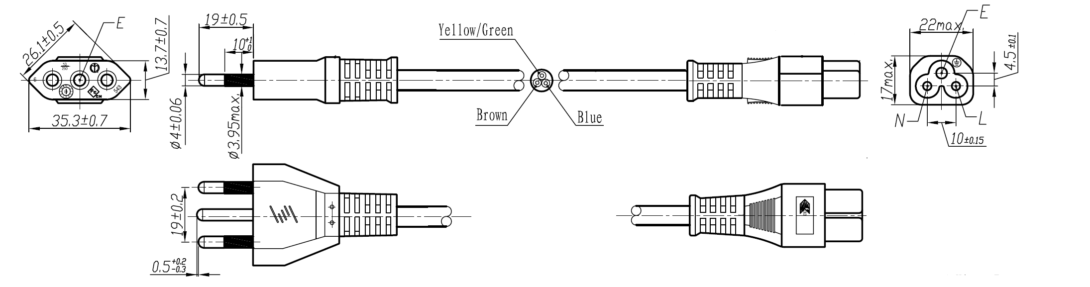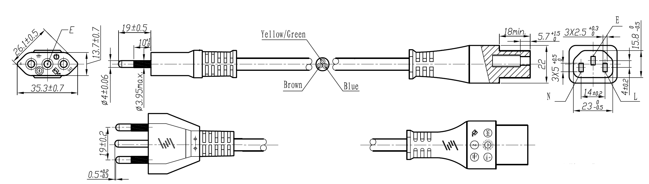 The 364-C5-2 is a power cord used in Italy with 3-prong plug, H05VVF3G0.75mm to the IEC 60320-C5 connector, is rated at 2.5A/250V and carries the IMQ Approval. This power Cord is for Class I Applications and can connect with any device using the IEC-60320-C6 Inlet.