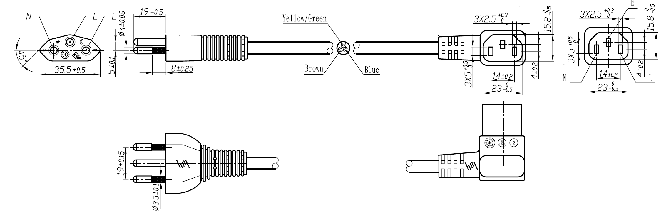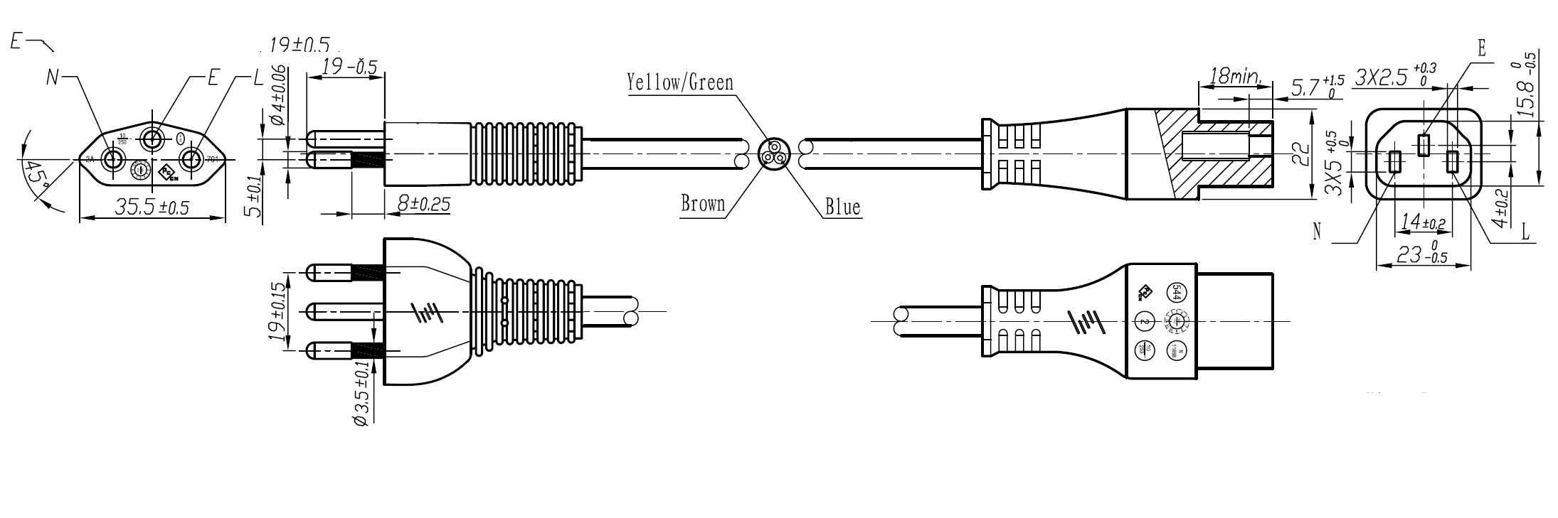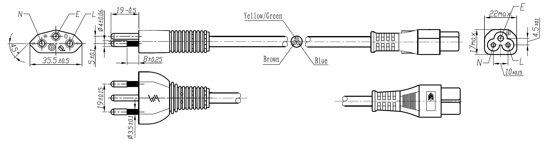 The 210-C5 is a power cord used in Switzerland with 3-prong plug, H05VVF3G0.75mm to the IEC 60320-C5 connector, is rated at 2.5A/250V and carries the SEV Approval. This power Cord is for Class I Applications and can connect with any device using the IEC-60320-C6 Inlet.