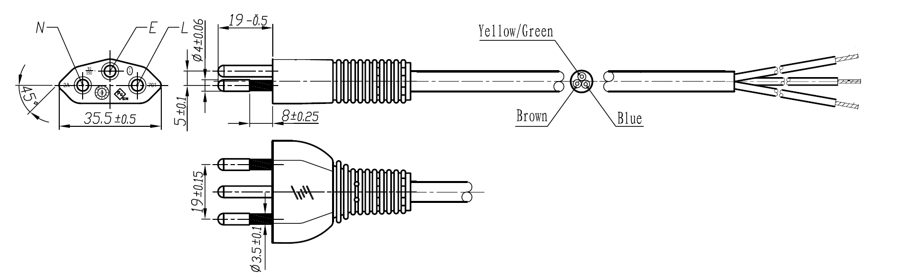 The 210-02 is a power cord used in Switzerland with 3-prong plug, H05VVF3G1.0mm to ROJ and strip, is rated at 10A/250V and carries the SEV Approval. This power Cord is for Class I Applications.