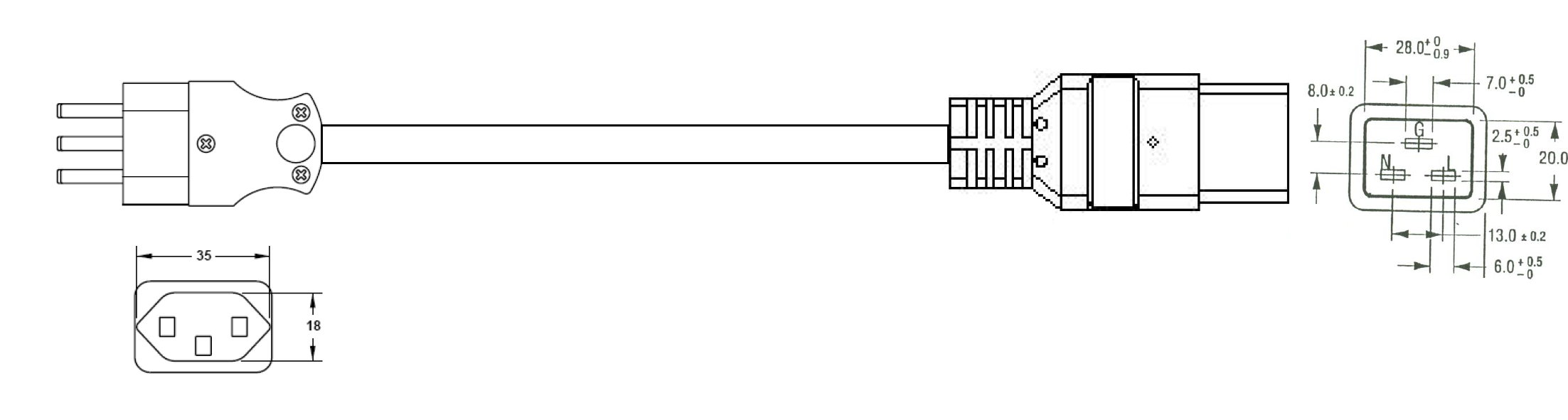 The 210-30 is a power cord used in Switzerland with 3-prong plug, H05VVF3G1.5mm to the IEC 60320-C19 connector, is rated at 16A/250V and carries the SEV Approval. This power Cord is for Class I Applications and can connect with any device using the IEC-60320-C20 Inlet.